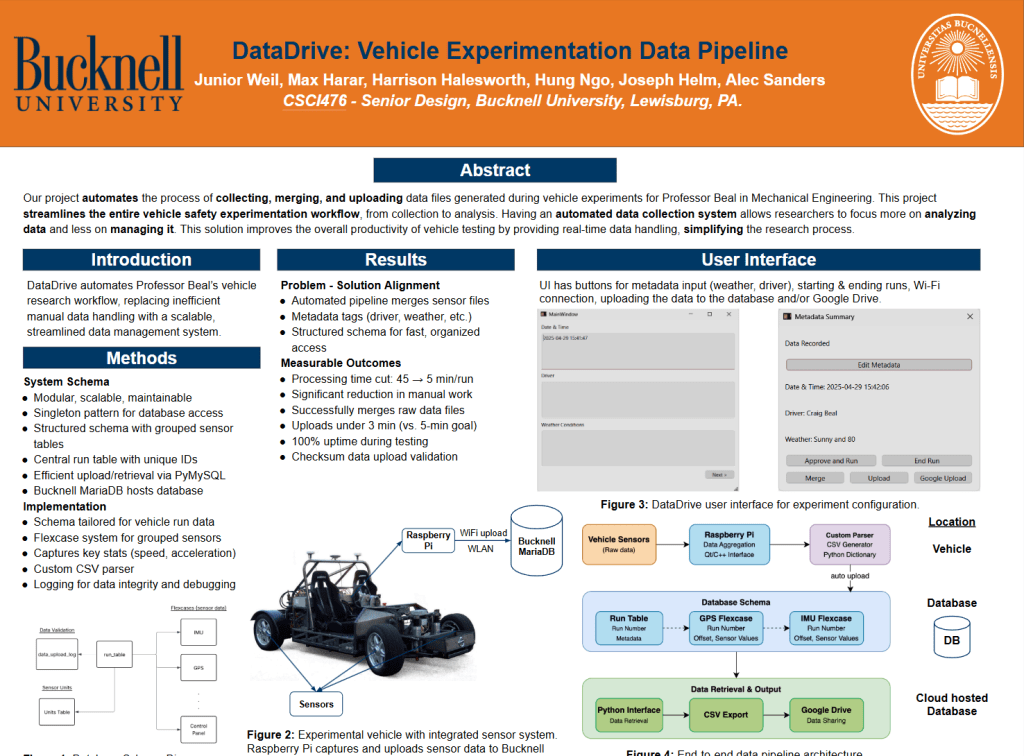 - Built an end-to-end data pipeline for vehicle safety experimentation. Programmed on a Raspberry Pi, our data pipeline handles collection, management, and organization of data, saving our client dozens of hours per week of administrative overhead